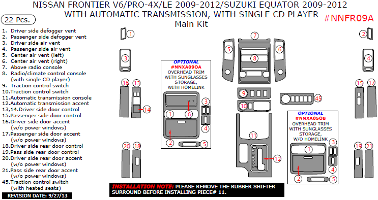 Nissan Frontier 2009, 2010, 2011, 2012, Suzuki Equator 2009-2012, SE V6/PRO-4X/LE, With Automatic Transmission, With Single CD Player, Main Interior Kit, 22 Pcs.