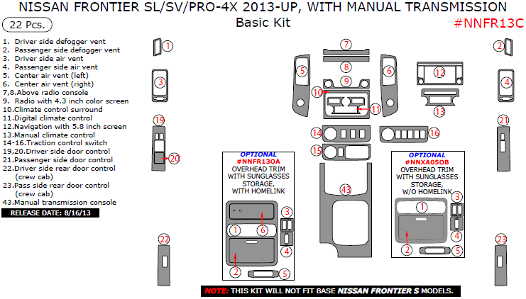 Nissan Frontier 2013, 2014, 2015, 2016, 2017, 2018, 2019, SL/SV/PRO-4X, With Manual Transmission, Basic Interior Kit, 22 Pcs.