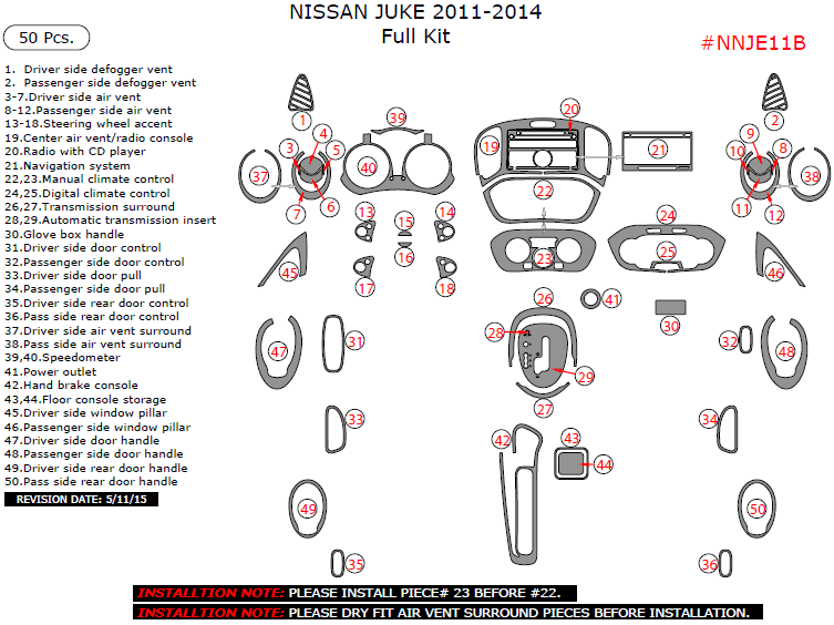 Nissan Juke 2011, 2012, 2013, 2014, Full Interior Kit, 50 Pcs.