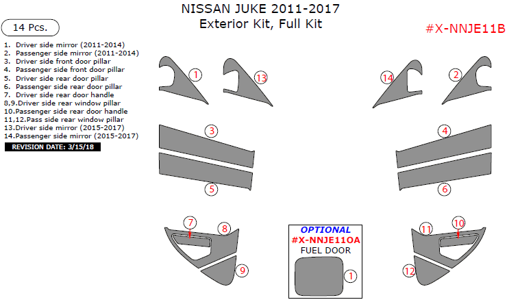 Nissan Juke 2011, 2012, 2013, 2014, 2015, 2016, 2017, 2016, 2017, Exterior Kit, Full Interior Kit, 14 Pcs.