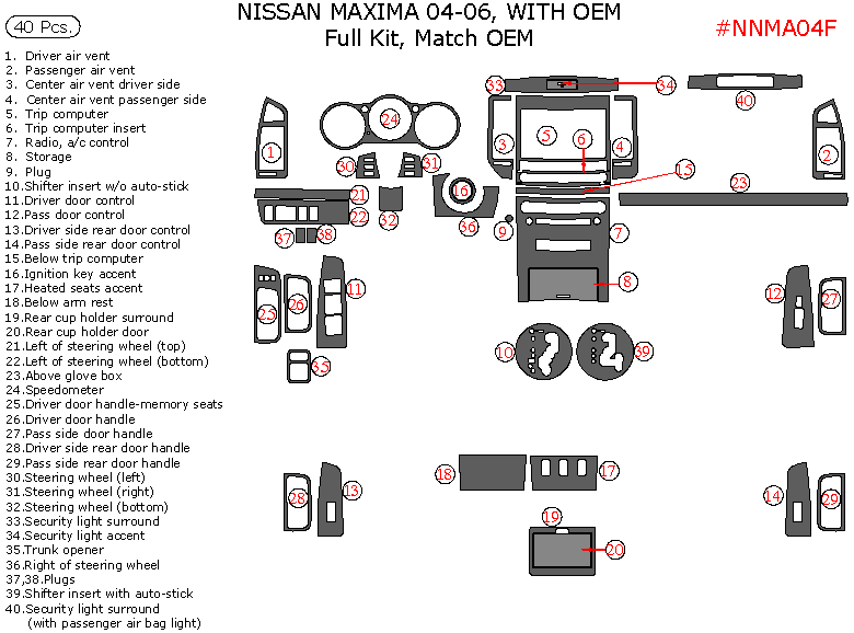 We offer a wide variety of colors and materials of Nissan Maxima 2004, 2005, 2006, With OEM, Full Interior Kit, 40 Pcs., OEM Match. Choose your favourite option and place an order.