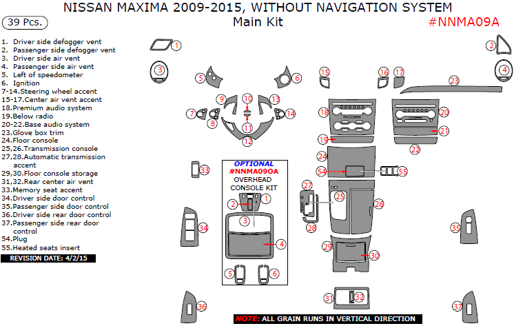 Nissan Maxima 2009, 2010, 2011, 2012, 2013, 2014, 2015, Without Navigation System, Main Interior Kit, 39 Pcs.