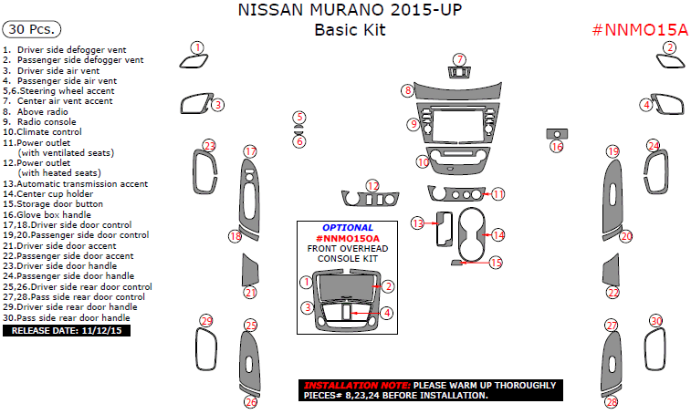 Nissan Murano 2015, 2016, 2017, Basic Interior Kit, 30 Pcs.