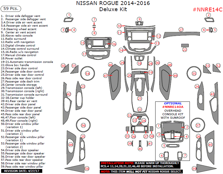 Nissan Rogue 2014, 2015, 2016, Deluxe Interior Kit, 59 Pcs.