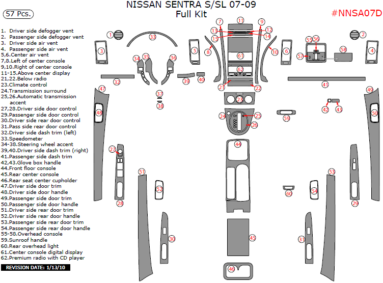 We offer a wide variety of colors and materials of Nissan Sentra 2007, 2008, 2009, Nissan Sentra S/SL, Full Interior Kit, 57 Pcs. Choose your favourite option and place an order.
