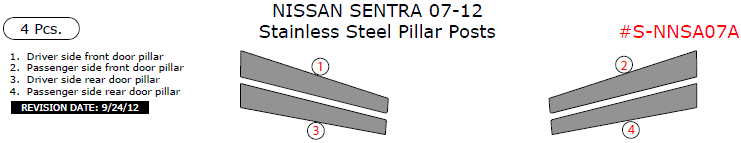 Nissan Sentra Sedan 2007, 2008, 2009, 2010, 2011, 2012, Stainless Steel Pillar Posts, 4 Pcs.