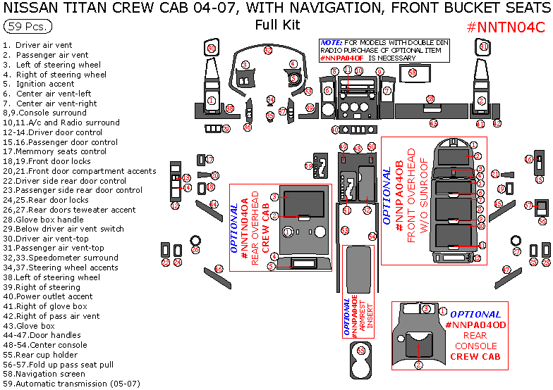 Full interior dash kit of 59 pieces for Nissan Titan 2004, 2005, 2006, 2007, crew cab, with navigation, front bucket seats is available in a variety of colors (red, black, etc.) and materials (wood grain, carbon fiber, etc.). Select your favourite option of the 2004-2007 Nissan Titan interior accessory and place an order to buy the high quality dash trim kit.