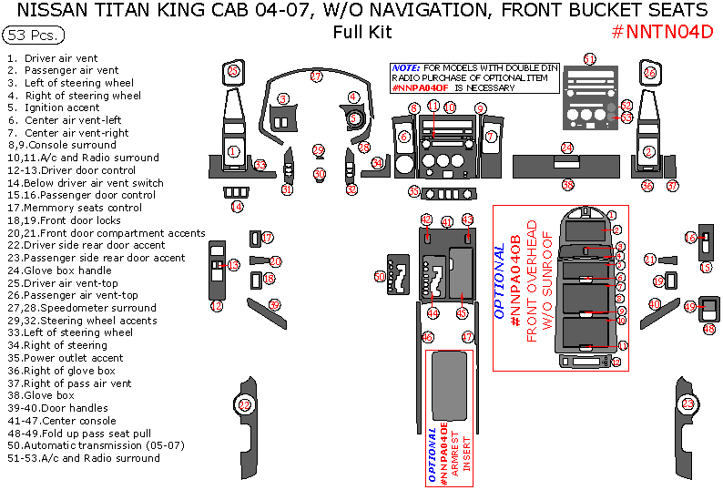 Nissan Titan 2004, 2005, 2006, 2007, King Cab, Without Navigation, Front Bucket Seats, Full Interior Kit, 53 Pcs.