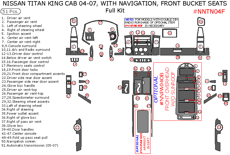 Nissan Titan 2004, 2005, 2006, 2007, King Cab, With Navigation, Front Bucket Seats, Full Interior Kit, 51 Pcs.