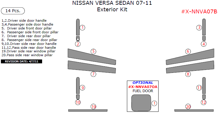 We offer a wide variety of colors and materials of Nissan Versa 2007, 2008, 2009, 2010, 2011, Exterior Kit (Sedan Only), 14 Pcs. Choose your favourite option and place an order.
