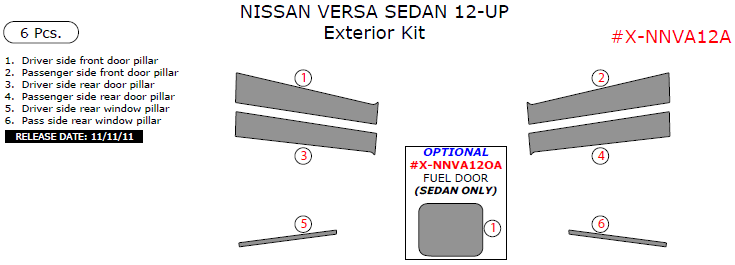 Nissan Versa 2012, 2013, 2014, Exterior Kit (Sedan Only), 6 Pcs.
