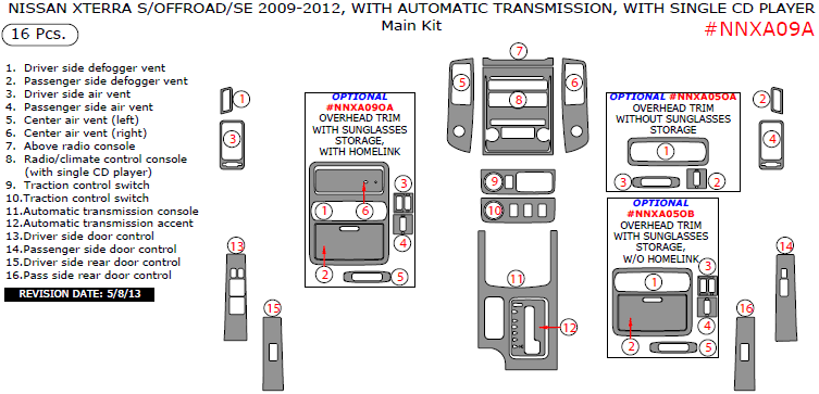 Nissan Xterra 2009, 2010, 2011, 2012, S/OFFROAD/SE, With Automatic Transmission, With Single CD Player, Main Interior Kit, 16 Pcs.
