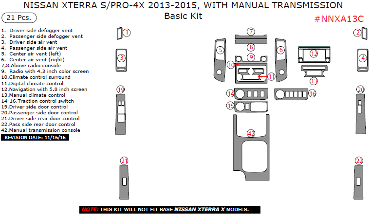Nissan Xterra S/PRO-4X 2013, 2014, 2015, With Manual Transmission, Basic Interior Kit, 21 Pcs.