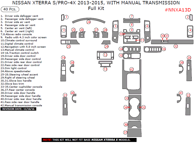 Nissan Xterra S/PRO-4X 2013, 2014, 2015, With Manual Transmission, Full Interior Kit, 40 Pcs.