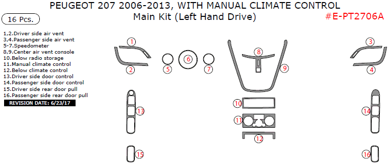 Peugeot 207 2006, 2007, 2008, 2009, 2010, 2011, 2012, 2013, With Manual Climate Control, Main Interior Kit (Left Hand Drive), 16 Pcs.