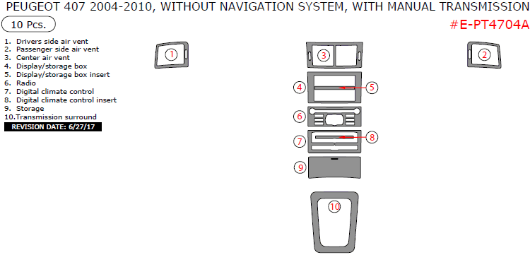 We offer a wide variety of colors and materials of Peugeot 407 2004, 2005, 2006, 2007, 2008, 2009, 2010, Interior Dash Kit, Without Navigation System, With Manual Transmission, 10 Pcs. Choose your favourite option and place an order.