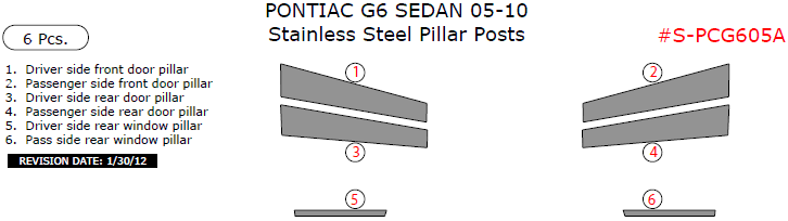 Pontiac G6 Sedan 2005, 2006, 2007, 2008, 2009, 2010, Stainless Steel Pillar Posts, 6 Pcs.