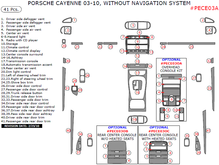 We offer a wide variety of colors and materials of Porsche Cayenne 2003, 2004, 2005, 2006, 2007, 2008, 2009, 2010, Interior Dash Kit, Without Navigation System, 41 Pcs. Choose your favourite option and place an order.