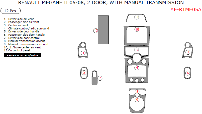 We offer a wide variety of colors and materials of Renault Megane 2005, 2006, 2007, 2008, 2 Door, Interior Dash Kit, With Manual Transmission, 12 Pcs. Choose your favourite option and place an order.