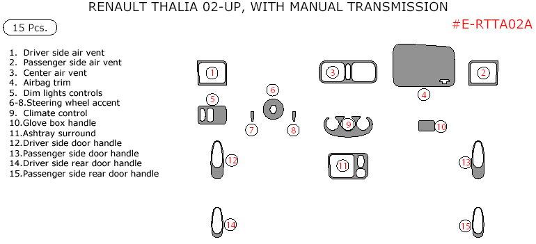 Renault Thalia 2002, 2003, 2004, 2005, 2006, 2007, 2008, 2009, 2010, 2011, 2012, 2013, 2014, 2015, Interior Dash Kit, With Manual Transmission, 15 Pcs.