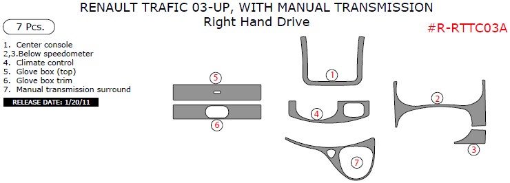 We offer a wide variety of colors and materials of Renault Trafic 2003, 2004, 2005, 2006, 2007, 2008, 2009, 2010, 2011, 2012, 2013, 2014, 2015, Interior Dash Kit, With Manual Transmission (Right Hand Drive), 7 Pcs. Choose your favourite option and place an order.