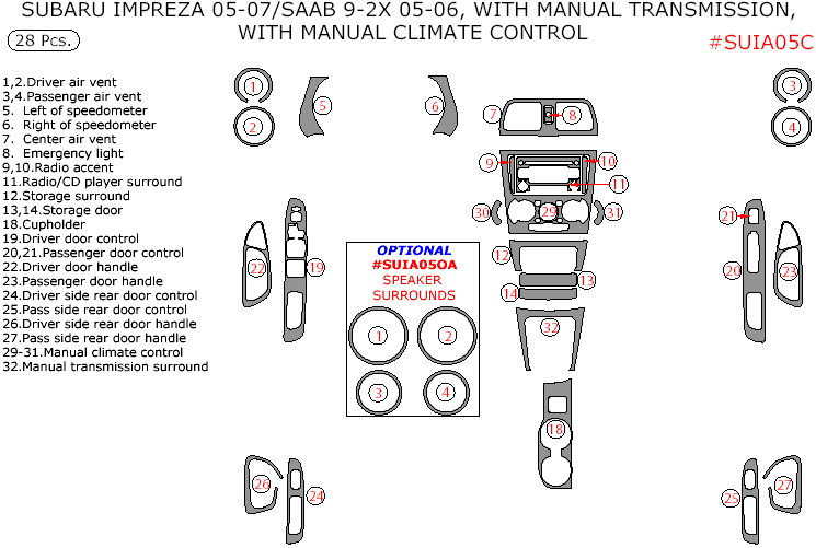 We offer a wide variety of colors and materials of Saab 9-2X 2005-2006, Subaru Impreza 2005, 2006, 2007, non-STI, With Manual Transmission, Interior Dash Kit, With Manual Climate Control, 28 Pcs. Choose your favourite option and place an order.