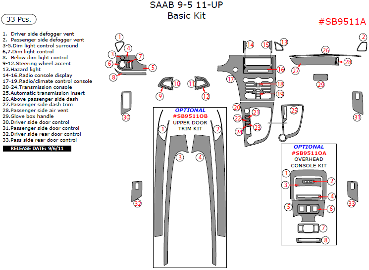 Saab 9-5 2011, 2012, 2013, 2014, 2015, Basic Interior Kit, 33 Pcs.