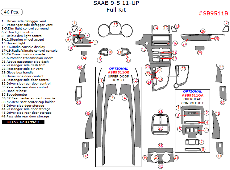 Saab 9-5 2011, 2012, 2013, 2014, 2015, Full Interior Kit, 46 Pcs.