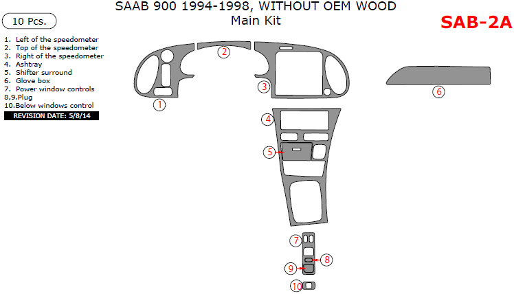 Saab 900 1994, 1995, 1996, 1997, 1998, Without OEM Wood, Main Interior Kit, 10 Pcs.