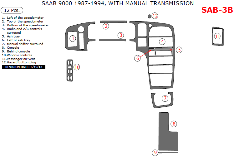 Saab 9000 1987, 1988, 1989, 1990, 1991, 1992, 1993, 1994, Interior Dash Kit, With Manual Transmission, 12 Pcs.