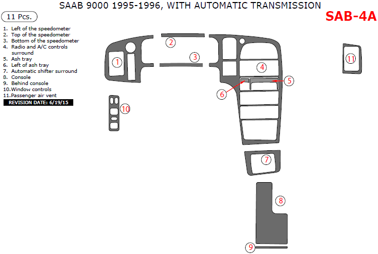 We offer a wide variety of colors and materials of Saab 9000 1995-1996, Interior Dash Kit, With Automatic Transmission, 11 Pcs. Choose your favourite option and place an order.