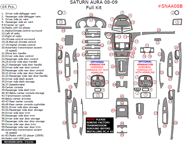 Saturn Aura 2008-2009, Full Interior Kit, 64 Pcs,