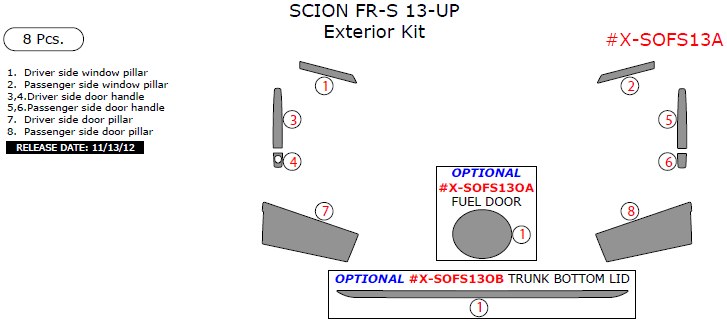 Scion FR-S 2013, 2014, 2015, Exterior Kit, 8 Pcs.