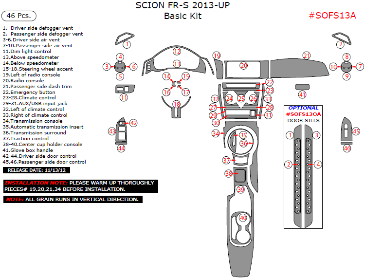 We offer a wide variety of colors and materials of Scion FR-S 2013, 2014, 2015, Basic Interior Kit, 46 Pcs. Choose your favourite option and place an order.