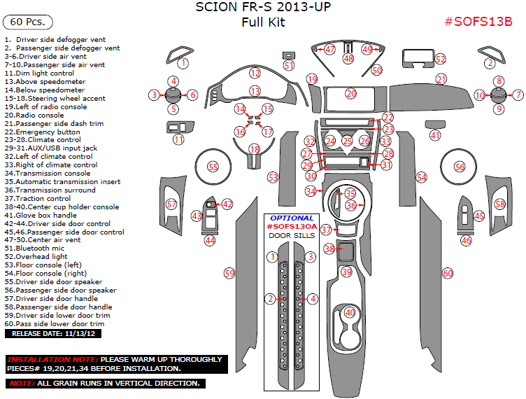 Scion FR-S 2013, 2014, 2015, Full Interior Kit, 60 Pcs.