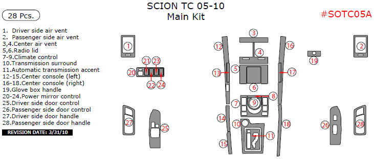 Scion tC 2005, 2006, 2007, 2008, 2009, 2010, Main Interior Kit, 28 Pcs.