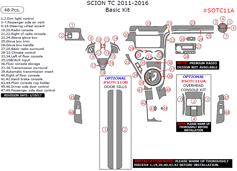 Scion tC 2011, 2012, 2013, 2014, 2015, 2016, Basic Interior Kit, 48 Pcs.