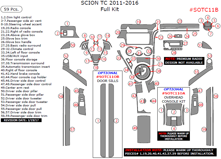 Scion tC 2011, 2012, 2013, 2014, 2015, 2016, Full Interior Kit, 59 Pcs.