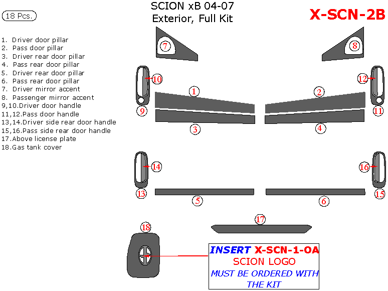 Scion xB 2004, 2005, 2006, 2007, Exterior Kit, Full Kit (ITEM X-SCN-1-OA must be ordered with this kit) , 18 Pcs.