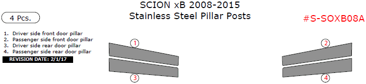 We offer a wide variety of colors and materials of Scion xB 2008, 2009, 2010, 2011, 2012, 2013, 2014, 2015, Stainless Steel Pillar Posts, 4 Pcs. Choose your favourite option and place an order.