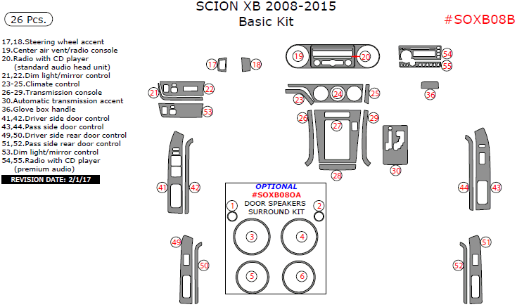 Scion xB 2008, 2009, 2010, 2011, 2012, 2013, 2014, 2015, Basic Interior Kit, 26 Pcs.
