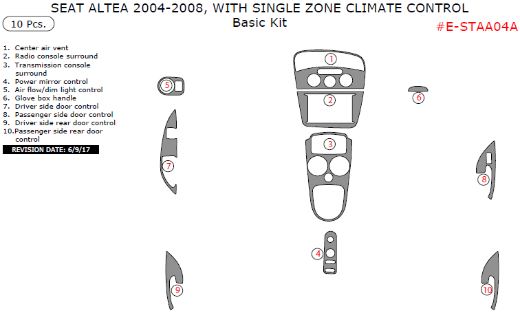 We offer a wide variety of colors and materials of Seat Altea 2004, 2005, 2006, 2007, 2008, With Single Zone Climate Control, Basic Interior Kit, 10 Pcs. Choose your favourite option and place an order.