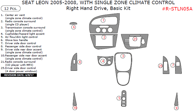 Seat Leon 2005, 2006, 2007, 2008, Right Hand Drive, With Single Zone Climate Control, Basic Interior Kit, 12 Pcs.