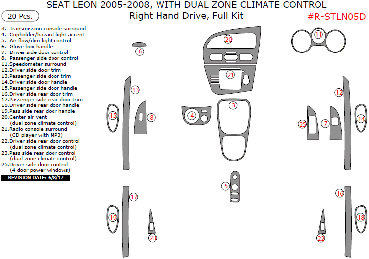 Seat Leon 2005, 2006, 2007, 2008, Right Hand Drive, With Dual Zone Climate Control, Full Interior Kit, 20 Pcs.