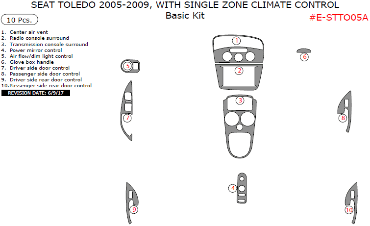 We offer a wide variety of colors and materials of Seat Toledo 2005, 2006, 2007, 2008, 2009, With Single Zone Climate Control, Basic Interior Kit, 10 Pcs. Choose your favourite option and place an order.