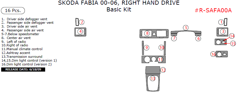 Skoda Fabia 2000, 2001, 2002, 2003, 2004, 2005, 2006, Right Hand Drive, Basic Interior Kit, 16 Pcs.