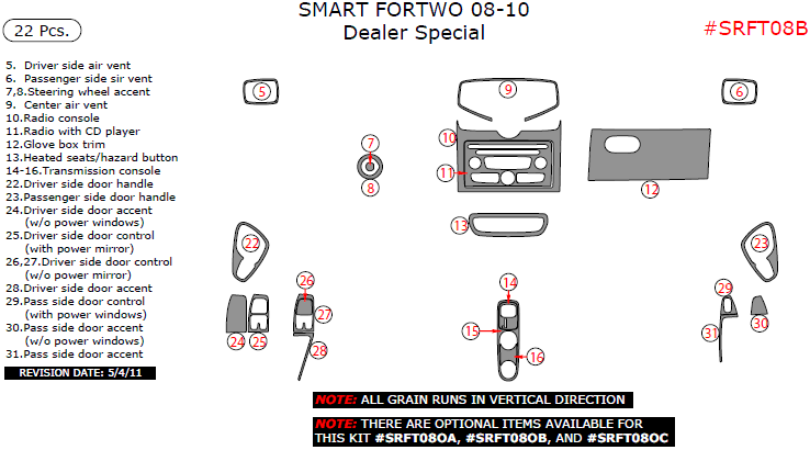 We offer a wide variety of colors and materials of Smart ForTwo 2008, 2009, 2010, Interior Dash Kit, Dealer Special, 22 Pcs. Choose your favourite option and place an order.