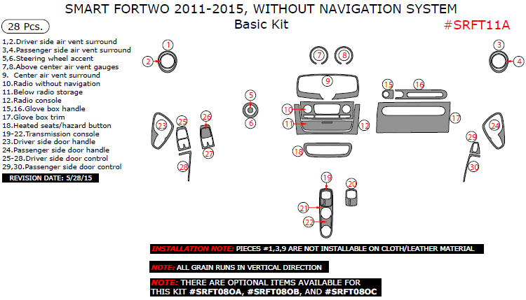 We offer a wide variety of colors and materials of Smart ForTwo 2011, 2012, 2013, 2014, 2015, Without Navigation System, Basic Interior Kit, 28 Pcs. Choose your favourite option and place an order.