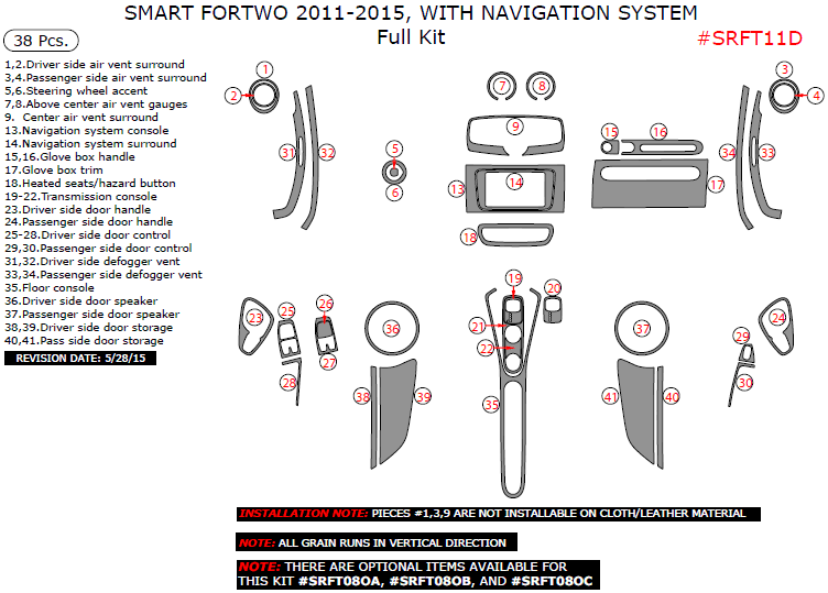 Smart ForTwo 2011, 2012, 2013, 2014, 2015, With Navigation System, Full Interior Kit, 38 Pcs.