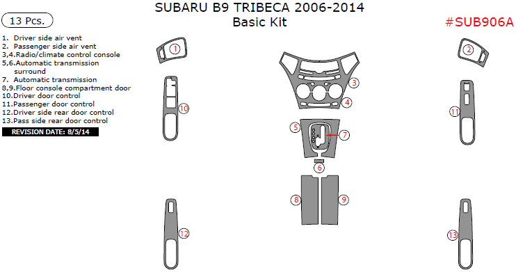 Subaru B9 Tribeca 2006, 2007, 2008, 2009, 2010, 2011, 2012, 2013, 2014, Basic Interior Kit, 13 Pcs.
